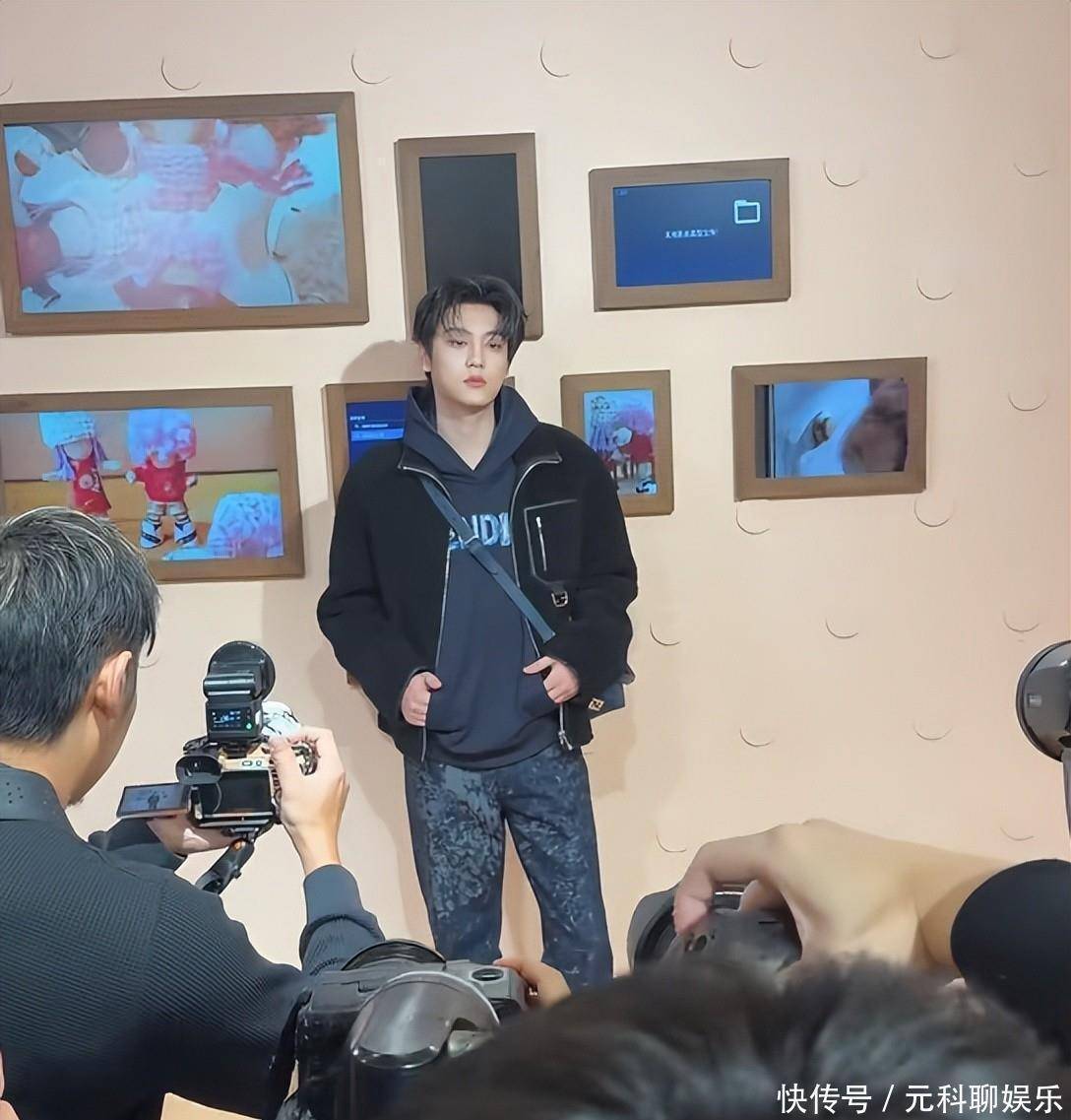这次他选择了一套休闲风的打扮,深蓝色的卫衣里面搭配一件黑色外套,看起来挺随意又有型的。上半身穿得有点多,显得肩膀有点宽,整个人就像是头重脚轻的样子。